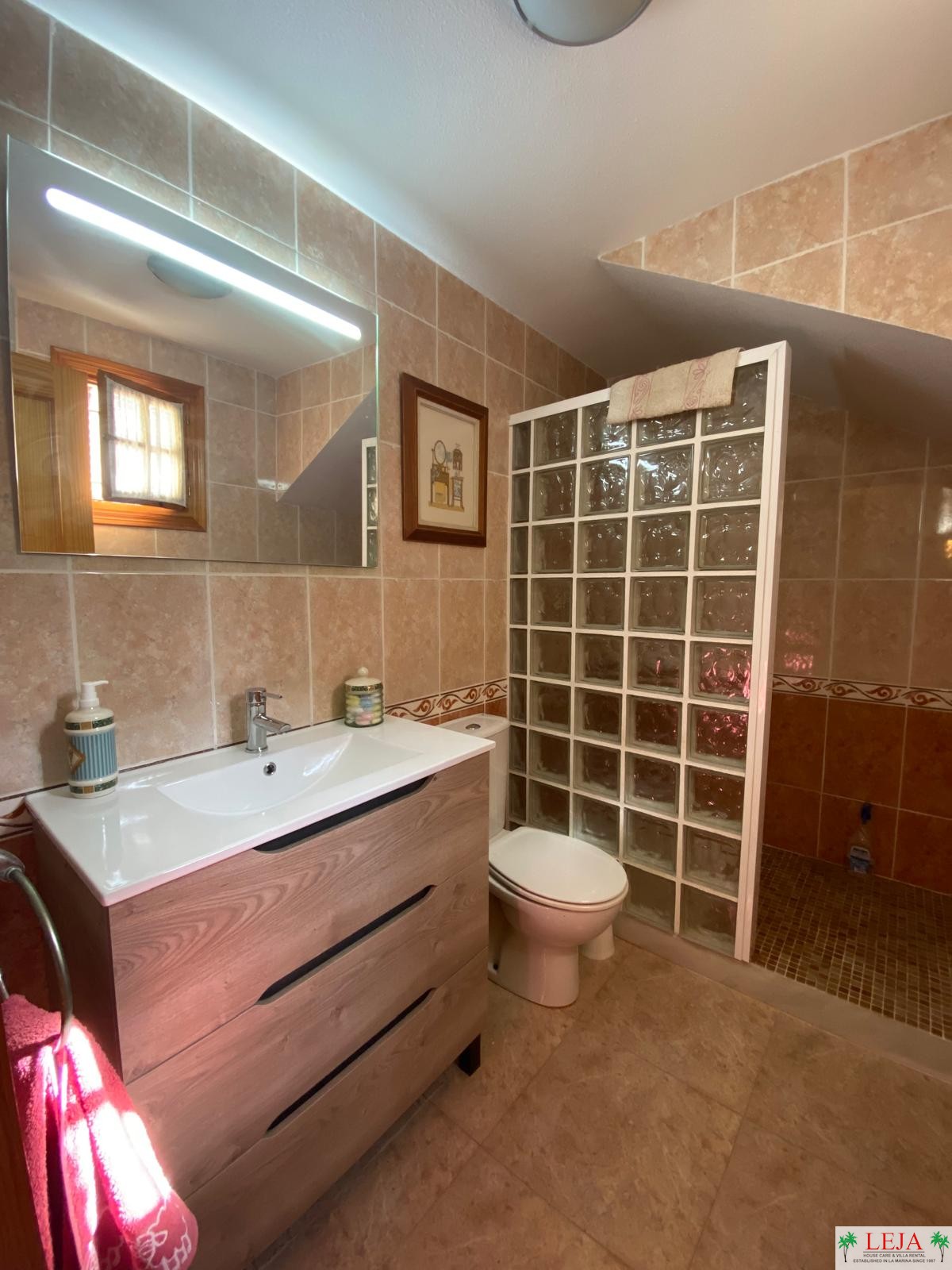 BATHROOM: Modernised with strip light mirror, basin and vanity unit, walk in shower with