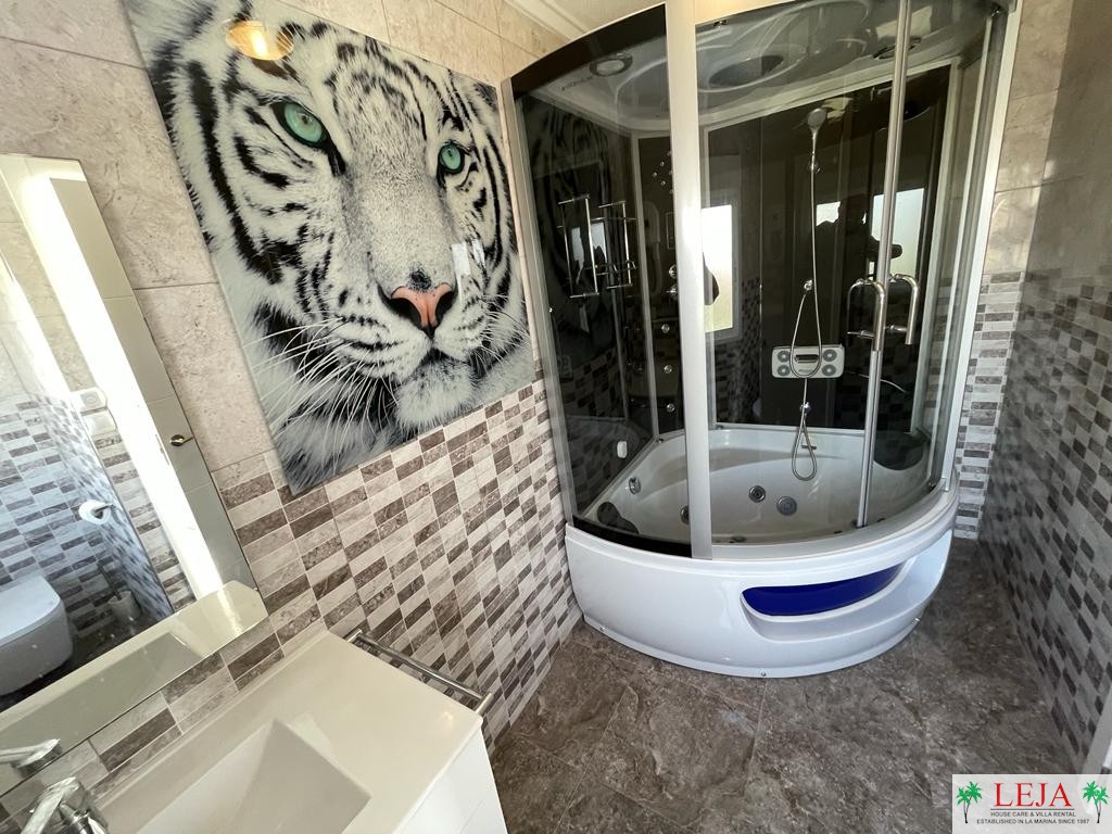 BEDROOM 3: Double bed, TV, Spacious Wardrobe, Ceiling fan, air con. En suite 2: Corner bath with overhead shower, WC, Mirror, Vanity unit
